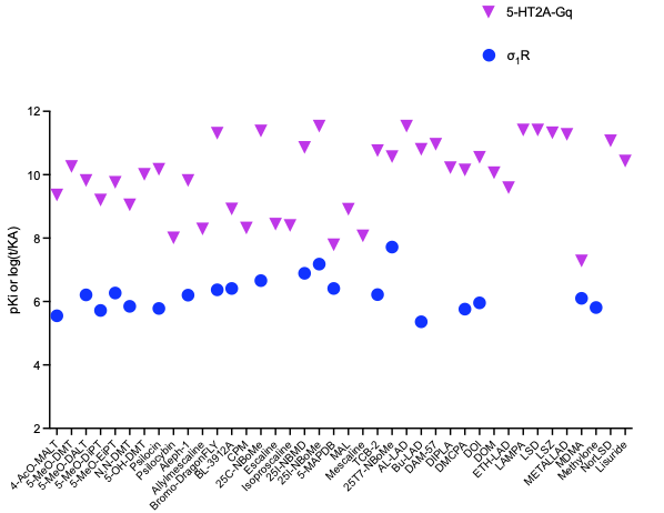 This could be true, but why would one ever focus on DMT as it has very low affinity for the sigma1-receptor (1-5 uM vs nM potency at 2A)? To investigate this I examined the sigma1-receptor affinities for many psychedelic drugs and compared this with their transduction coefficients for activating 5-HT2A receptor at the Gq pathway using data from our recent paper in Neuron.